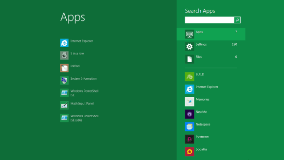 Windows 8 nu are vreo forma de cautare in Start Menu.De fapt, nici nu are legendarul Start Menu cu care ne-am obisnuit.Asta nu insemna ca nu exista o metoda eficienta de a gasi ceva.Tot ce trebuie sa faci este sa scrii orice, iar in partea drepta va aparea o casuta ce-ti va da rezultatele.Capacitatea de cautare este mai puternica acum, aratandu-ti toate rezultatele atat din fisiere cat si app-uri.