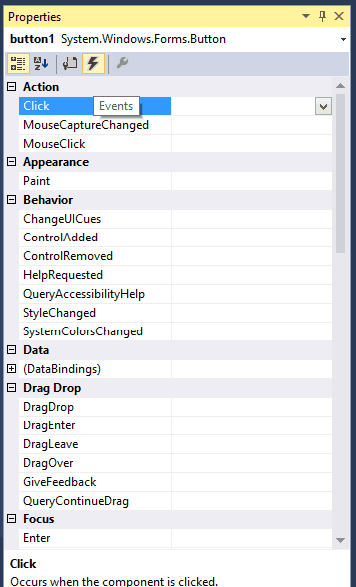 Toate aceste elemente sunt practic lucruri de bază atunci când vine vorba de evenimente. În practică, nu lucrăm, așa cum am spus mai sus, cu astfel de programe explicite, în materie de evenimente. Atunci când avem o fereastră cu un buton pe ea, dacă dăm click-dreapta pe buton și mergem la Properties, vom observa o fereastră în partea dreaptă a ecranului în care putem seta diverse proprietăți asociate butonului, precum: culoare, grosime margini, culoare margini, imagine de fundal, text, locație, mărime, aliniere, etc. Dacă dăm click pe iconița cu fulger tot din partea de sus a ferestrei de proprietăți, vom vedea o listă mare cu…evenimente! Ce fel de evenimente? Păi evident, legate de buton, că despre el vorbim! Spre exemplu: Click, MouseLeave, MouseHover, MouseEnter, Move, etc. Dacă dăm dublu-click pe oricare din aceste evenimente, vom fi trimiși la hander-ul de eveniment, deci direct la cod. Mediul de dezvoltare creează automat metoda subscriber, noi trebuie doar să scriem codul executabil.
